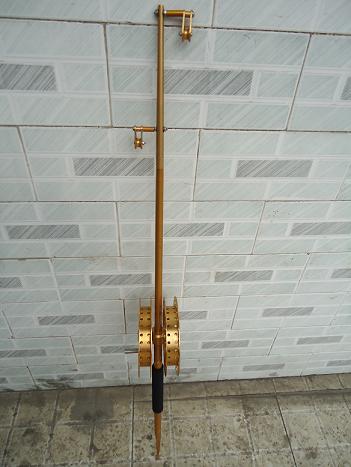 5、在主線上粘有膠布印記的地方(即掛過誘餌小袋的地方)掛上有釣餌的口線, 隨主線送到喂窩處垂釣。 6發(fā)現(xiàn)浮子被子拖入水中時(shí),握著手柄將繞線器用力往上一抬,主線牽動(dòng)釣線移 位,魚兒便上鉤了,再搖動(dòng)繞線器,將魚兒收回岸邊摘下。 三、過 河 釣 技 巧 (一)、單線雙放 1左線輪。一般設(shè)定安裝主放線,應(yīng)在上方。在牽線過河時(shí),將左線輪的主 線拉出一小部分穿過抬竿的左上滑輪后,再由上向下穿過背竿滑輪,將線頭上打一個(gè) 稍微比上滑輪大點(diǎn)的小圈掛在抬竿的右上滑輪上,**實(shí)現(xiàn)了單線雙放的設(shè)置。這時(shí), 你拉動(dòng)主竿或背竿,用姆指輕輕壓住線輪外緣,**可輕松實(shí)現(xiàn)一線雙放的功能; 2右線輪。一般安裝主釣線,用于懸掛仕掛牌,應(yīng)在下方。當(dāng)背竿拉到對(duì)岸 適當(dāng)位置時(shí),將主釣線穿過右上滑輪后與主放線進(jìn)行雙線連接,適當(dāng)松緊雙線,**完 成了主線的架設(shè)。 四、抬釣各部件之標(biāo)準(zhǔn)名稱(如圖)